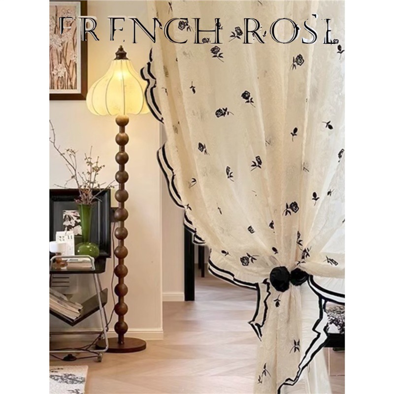 黒い刺繍のバラのフランス式の古風のクリーム風の小さい香りの風のロマンチックなレースの紗のカーテンは光を通さないで人の窓の紗に通じません。