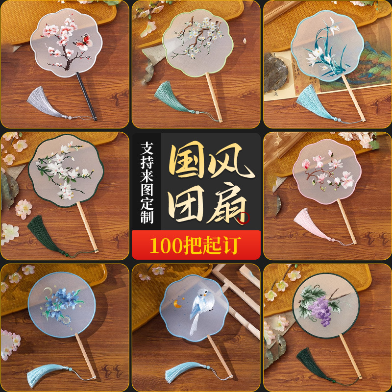 中国風団扇カスタム両面刺繍古風扇子蘇刺繍女漢服ダンス八弁刺繍円扇カスタム