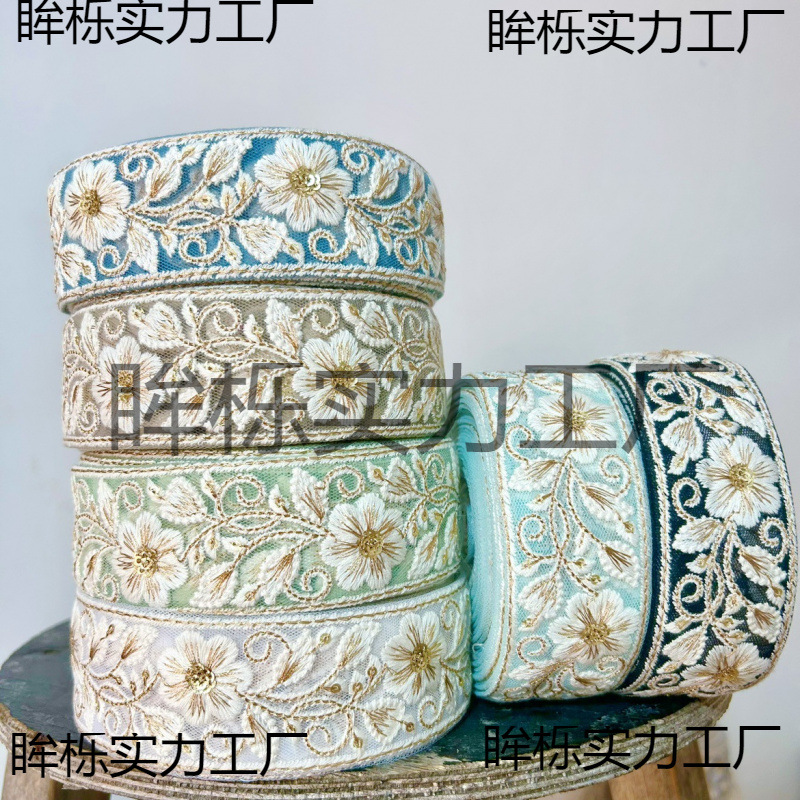 印度刺绣丝带网纱底淡雅花朵金线刺绣花边织带手工DIY配料宽4cm