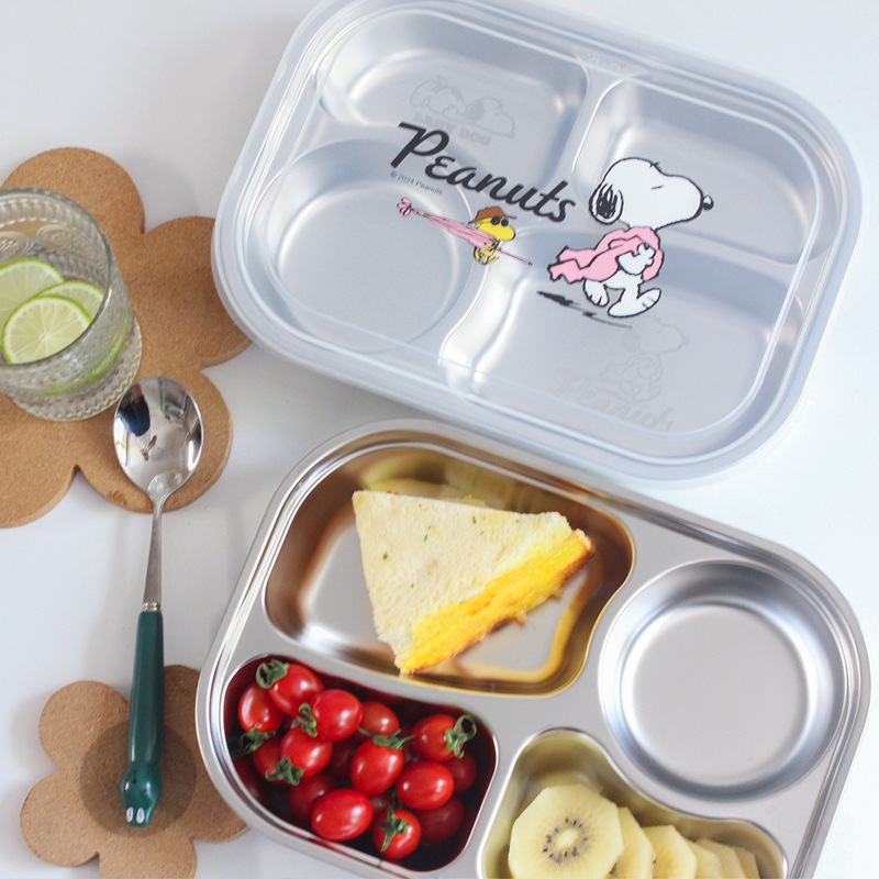 規格品のスヌーピーの蓋付きの大きいサイズの四格の弁当箱は食事を分けます。