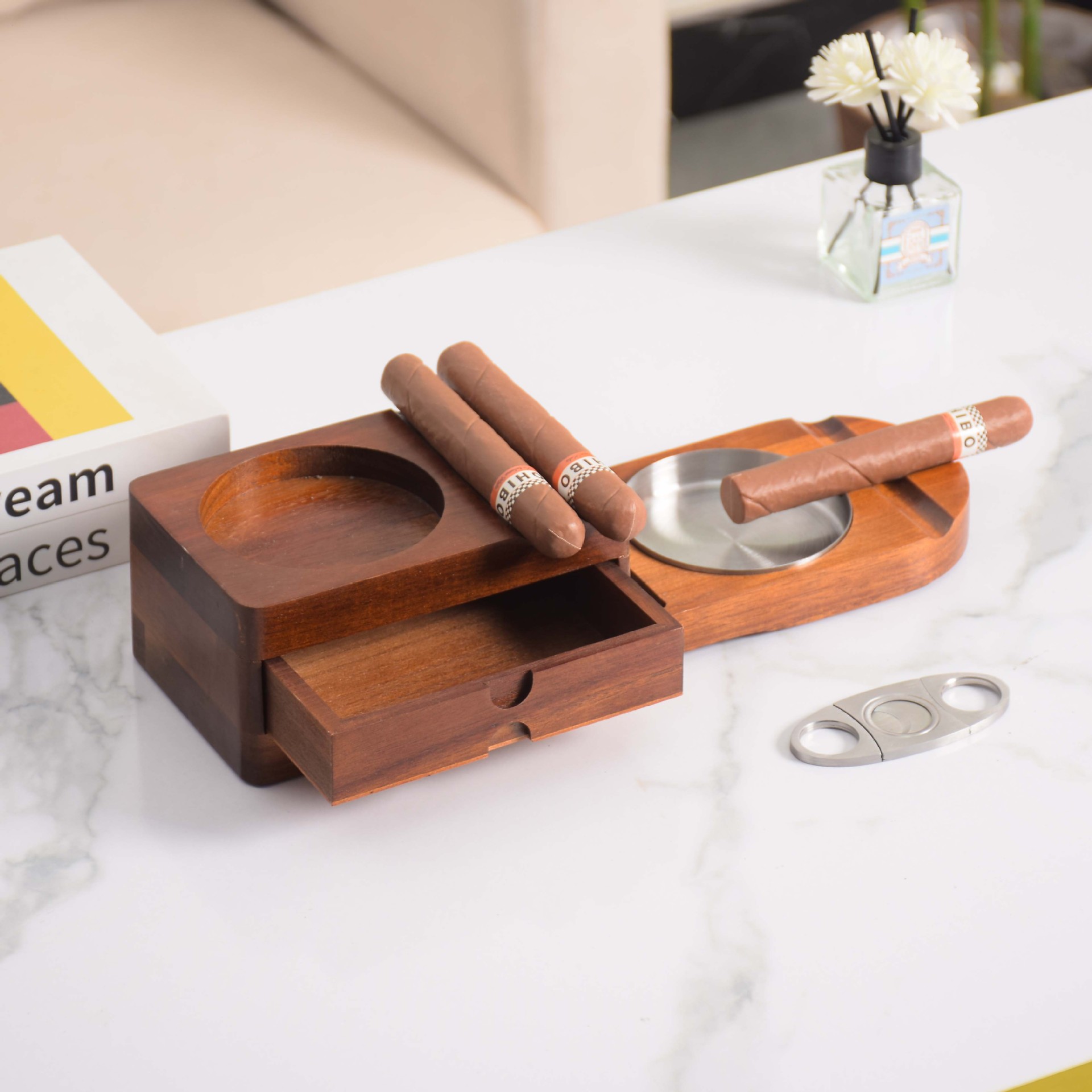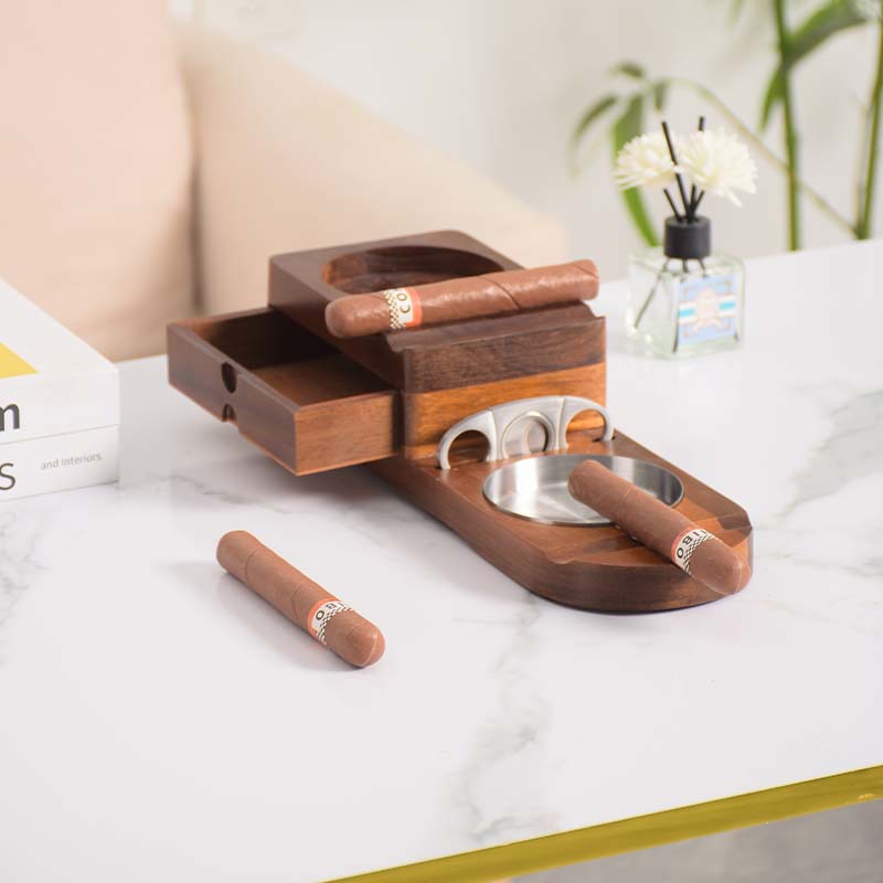 クロスボーダー木製シガー収納ボックス木製シガー灰皿家庭用ウイスキーカップホルダーにはシガーカッターが付属しています