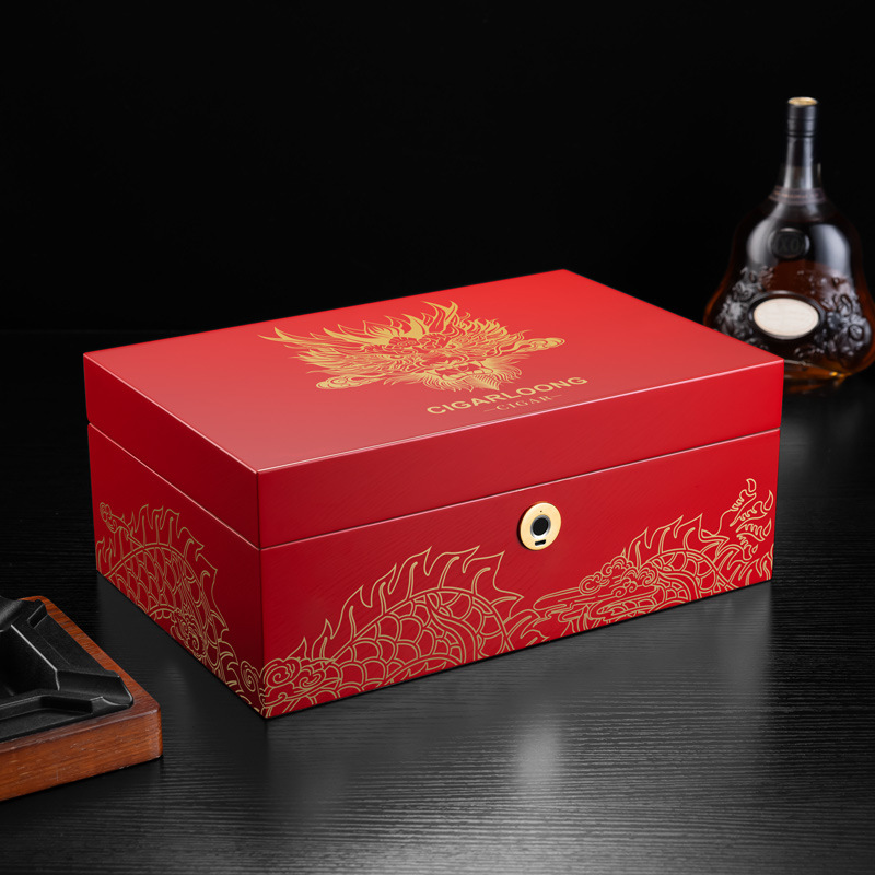 ナスの竜のシガーケースのシマツの木の指紋のロックは明かりの中国の赤い金龍の紋様の実木の保湿箱のCA-24HZを持ちます。