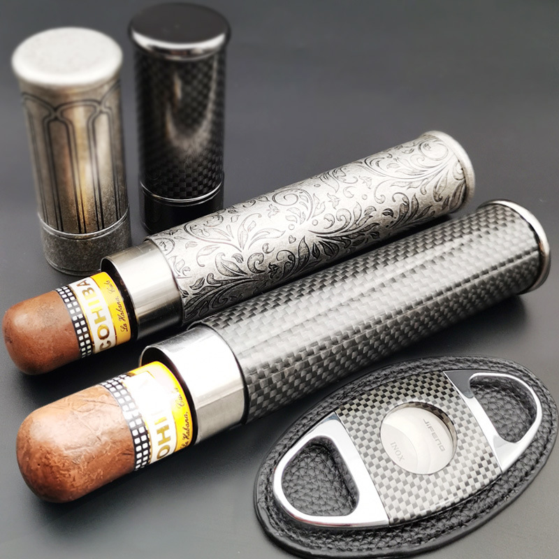 越境販売中、高級ステンレス製シガーチューブケース、カーボンファイバー製筒型シングルシガーホルダー、携帯用金属製喫煙具