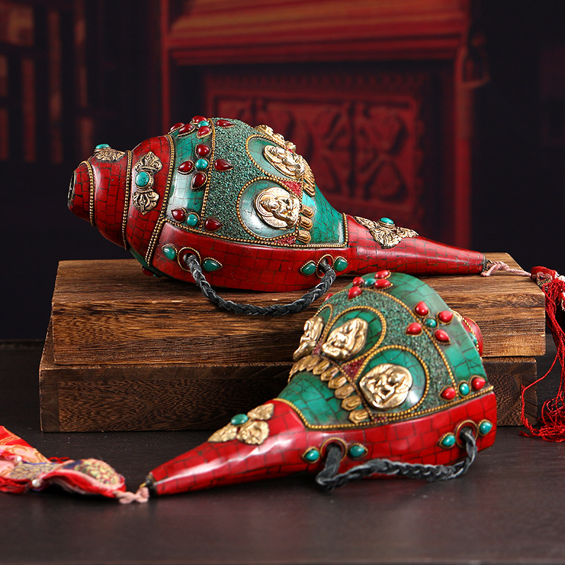 ネパールの手作りの羅仏家の左旋右の回転のサザエの置物のチベット式の彩色絵は銀メッキの五方仏の密宗の供具を入れます。