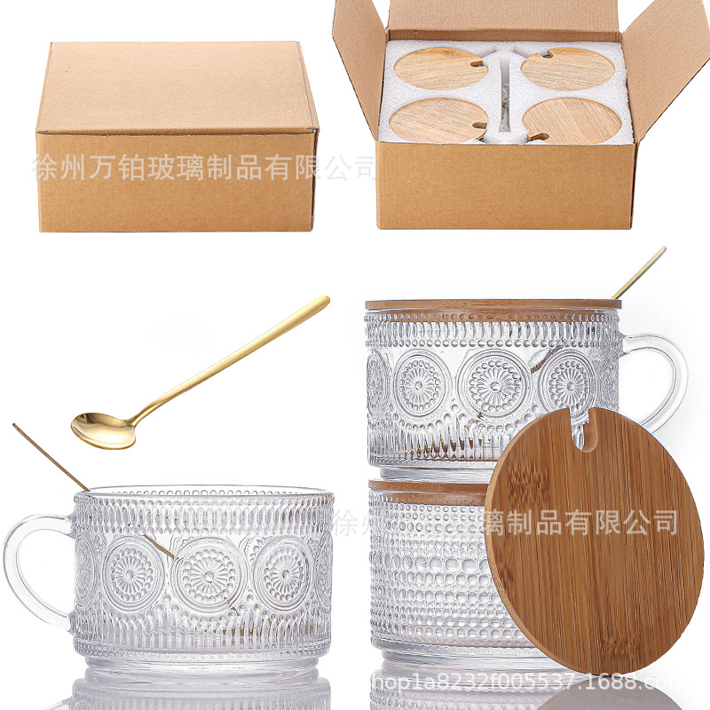 アマゾン レトロ オートミールカップ エンボス加工 ひまわり柄 朝食カップ 蓋とスプーン付き ミルクカップ ハンドル付き ガラス製コーヒーカップ