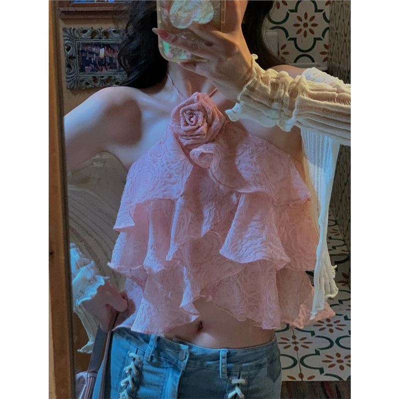 セクシーなローズウォーターデザインのホルターネックキャミソールレディース夏新作甘辛へそ出しショートトップ