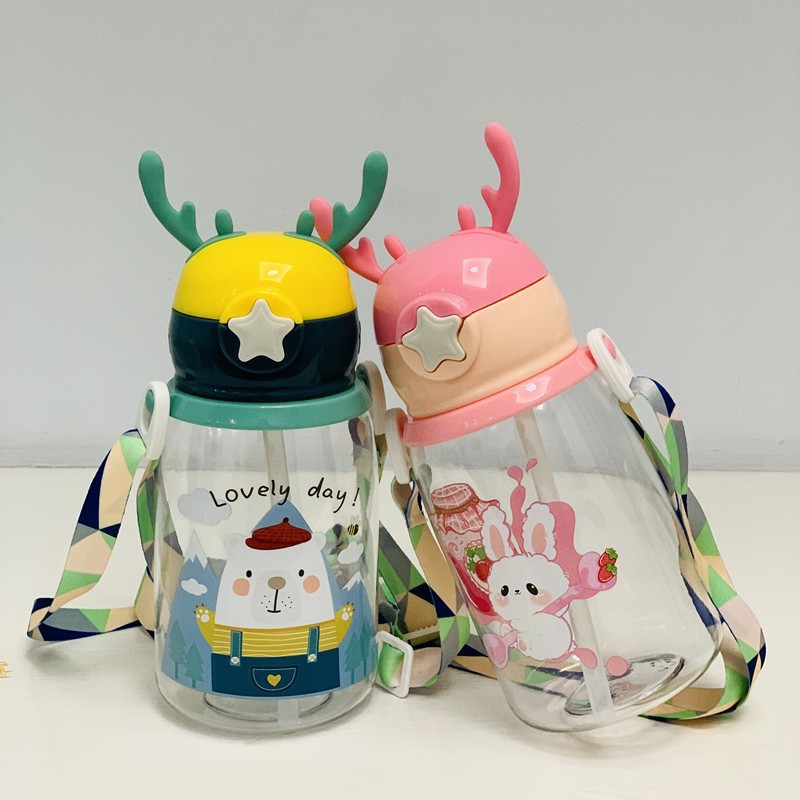 新しい熱売プラスチックカップストラップ付きストロー男女学生子供カップクリエイティブ漫画鹿角カップ宇宙カップ