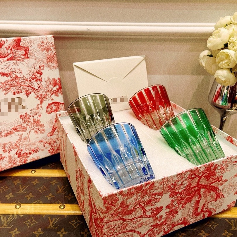 D家のまぶしい4色の水晶のグラスの洋画の杯のウイスキーの杯の水晶はカラーの手描きのギフトボックスの包装を切ります。