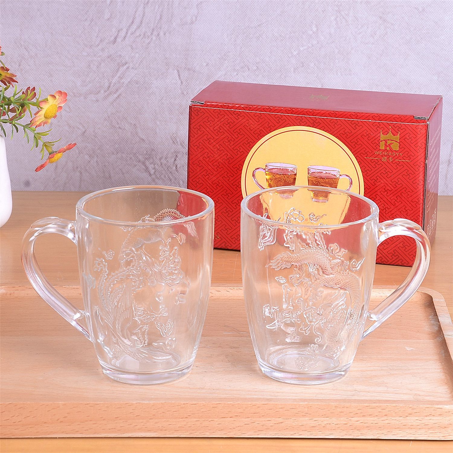 家用玻璃水杯两件套 龙凤对杯 玻璃把杯套装 珠宝会销礼品杯批发