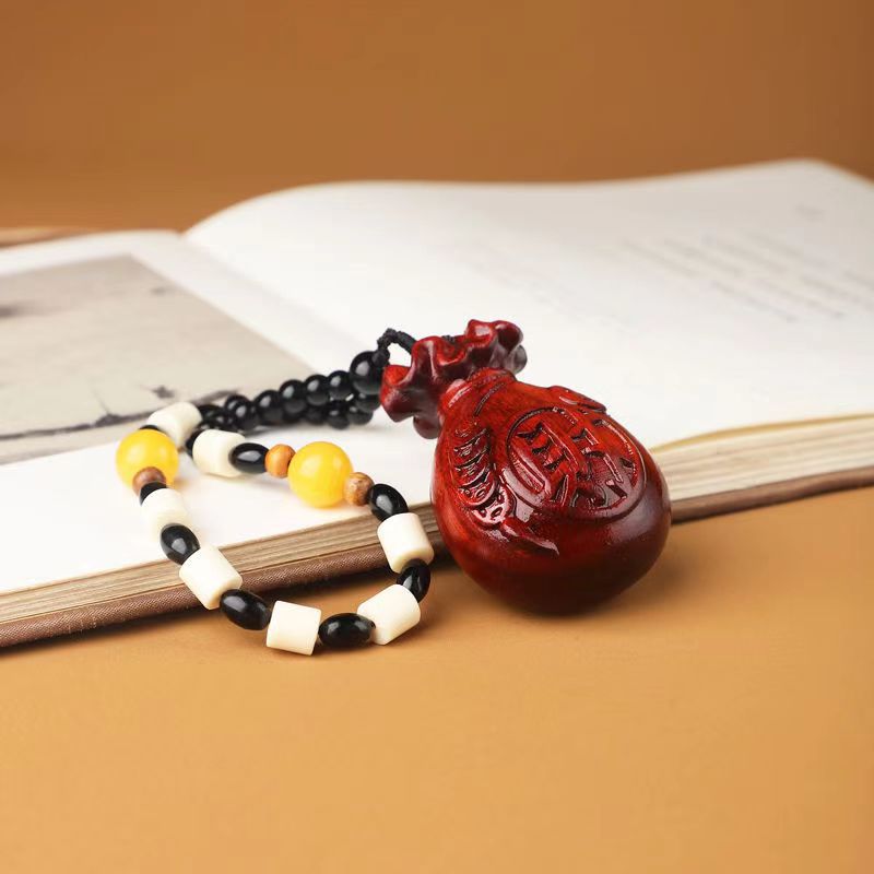 紫檀木のお金の袋の取っ手の件の実木の彫刻の福袋はペンダントを身につけて工芸品の木製の贈り物の文を飾って遊びます。