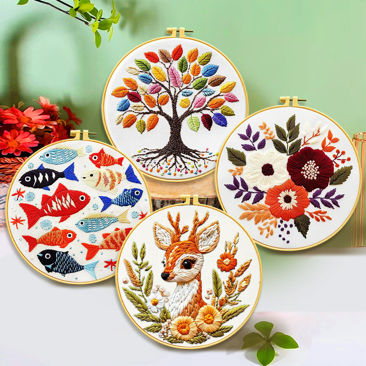 国境を越えた人気の花鹿魚の木の新素材刺繍 DIY 自分で刺繍 シンプルな刺繍 初心者向けの入門装飾