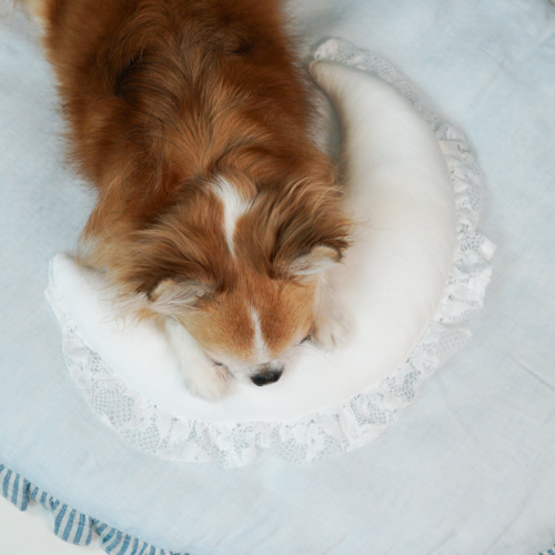 新しいタイプのペットのぬいぐるみの犬は枕を抱いてシミュレーションします。