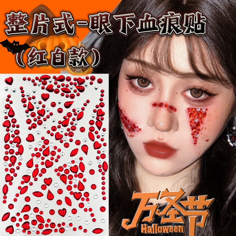 ハロウィン用フェイスステッカー、赤い宝石、氷の塊、小さなダイヤモンド、特殊形状のダイヤモンド、ホラー風模擬血漿、涙のダイヤモンド