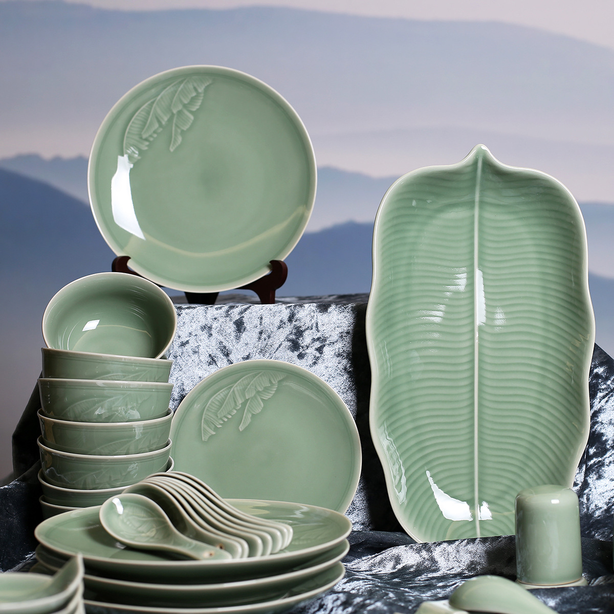 新しい中国式の日本式の北欧の軽い豪華な復古のホテルは台の竜泉の双緑の高級な料理の陶磁器の食器のセットを並べます。