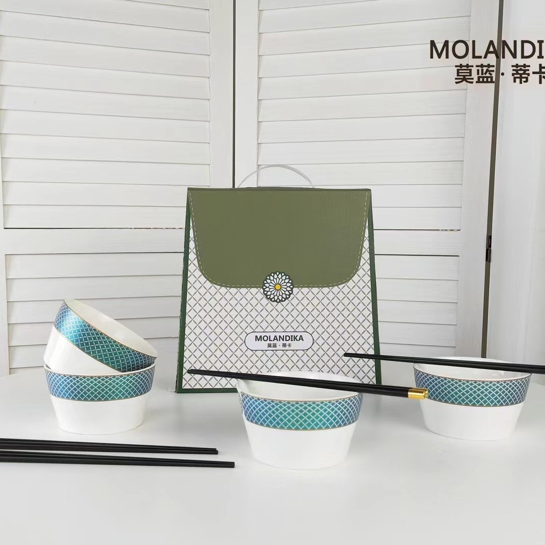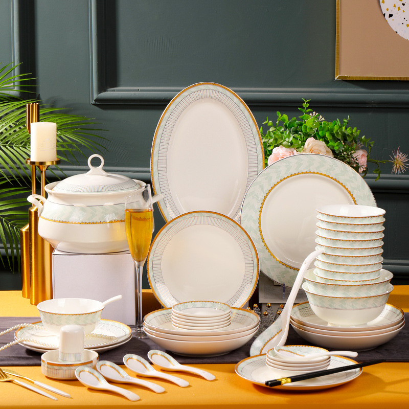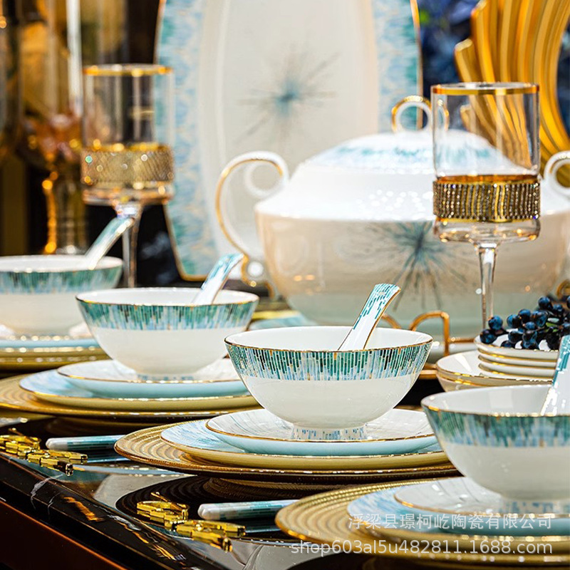 北欧風シンプル骨磁器食器セット景徳鎮軽豪華釉薬下彩碗皿セット家庭用引っ越しプレゼント