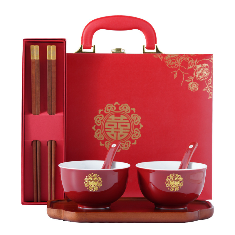 中国式の結婚式の陶磁器の喜びの碗の1対の円形の赤い結婚の付き添いの碗の箸のセットの装備の結婚用品の新婚の贈り物