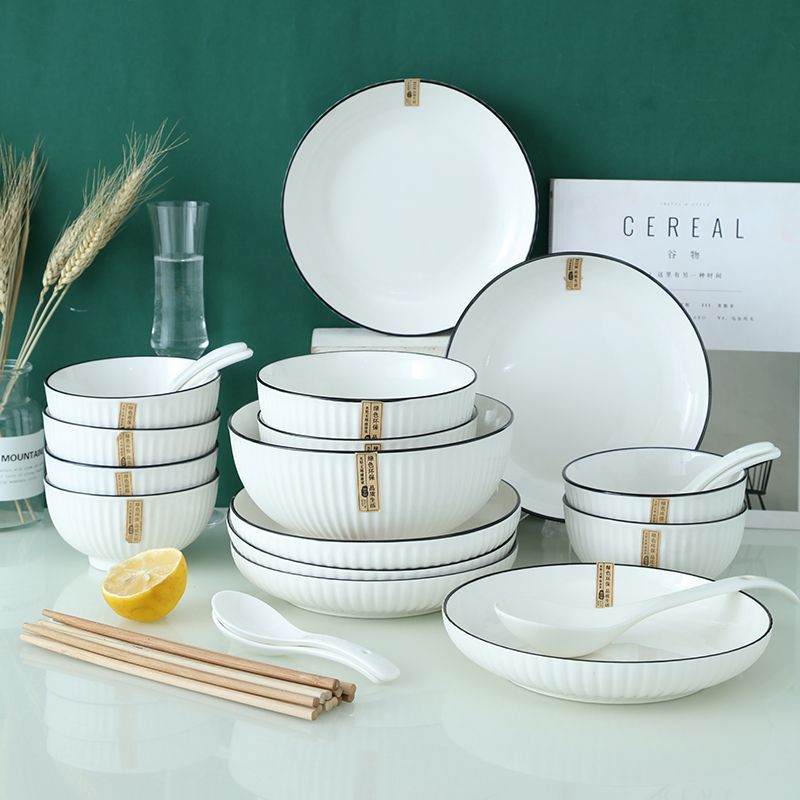 黒線碗皿箸家庭用シンプル風陶磁器食器セット