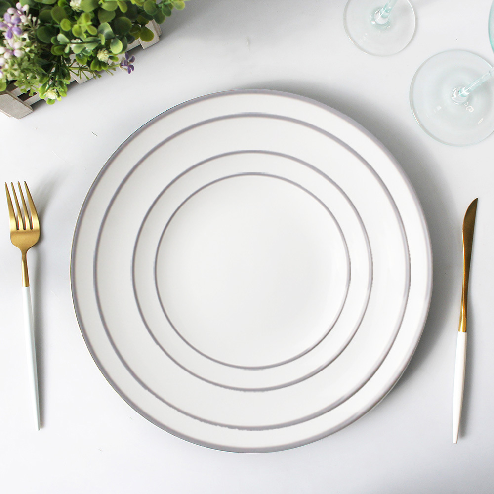 工場直接供給シンプルなシルバーエッジハイボーンチャイナディナープレートセラミックシングルシルバーラインボーンチャイナプレートクリエイティブホーム食器セット