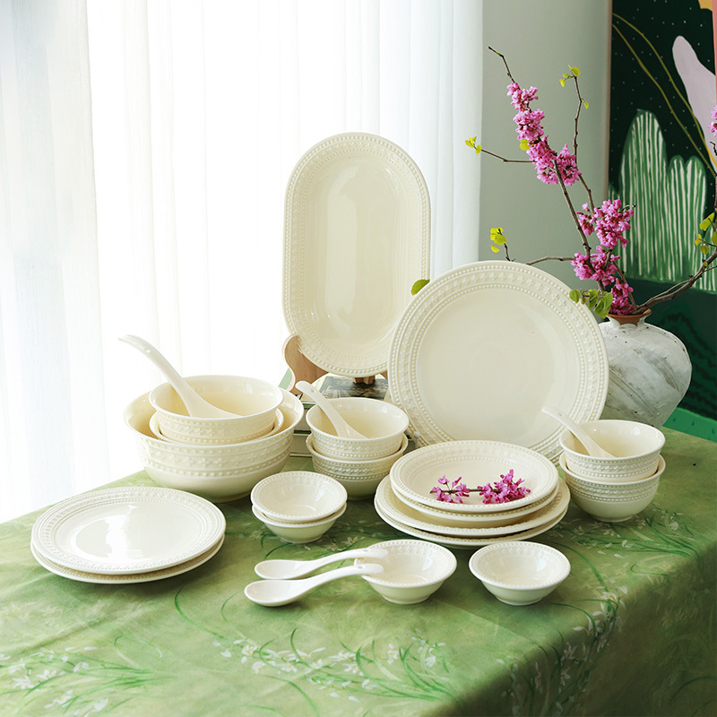 2025浮き彫りフランスクリーム風釉薬下彩食器セット家庭用高颜値食器セット食器セット