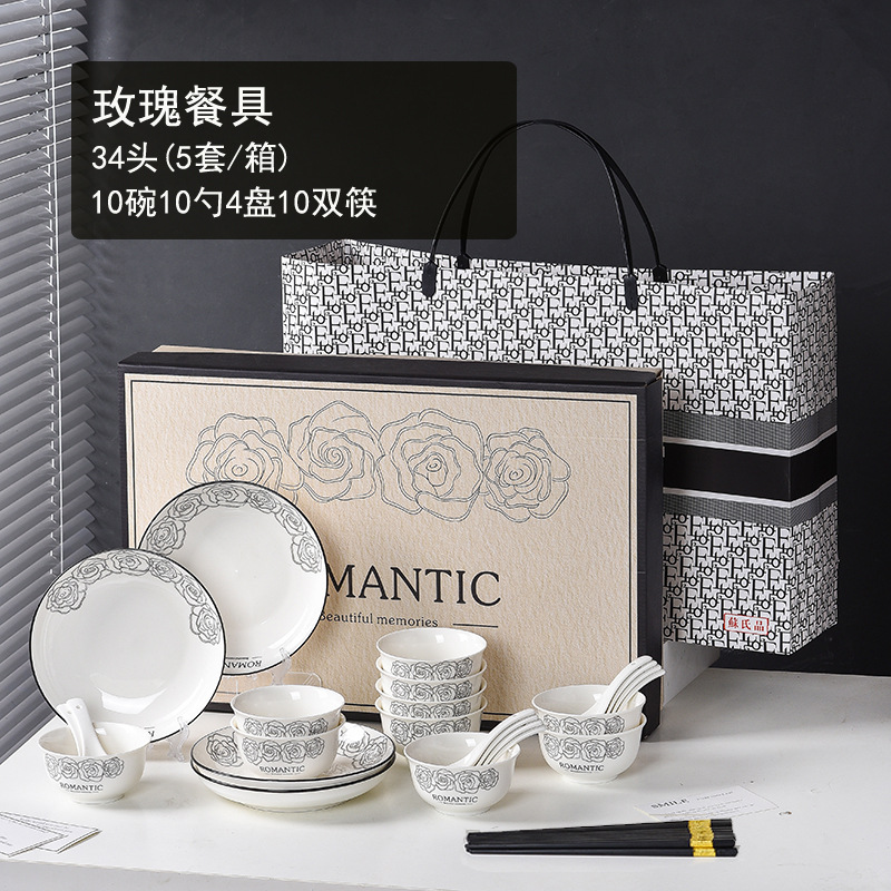 高級陶磁器食器ヘボン風薔薇セット茶碗皿大湯碗スプーン箸皿味皿ギフトボックス