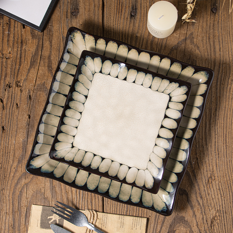 ヨーロッパ式レトロ釉薬下彩陶磁器ステーキ皿創意洋食角皿手描きパスタ皿窯釉薬料理皿卸売り