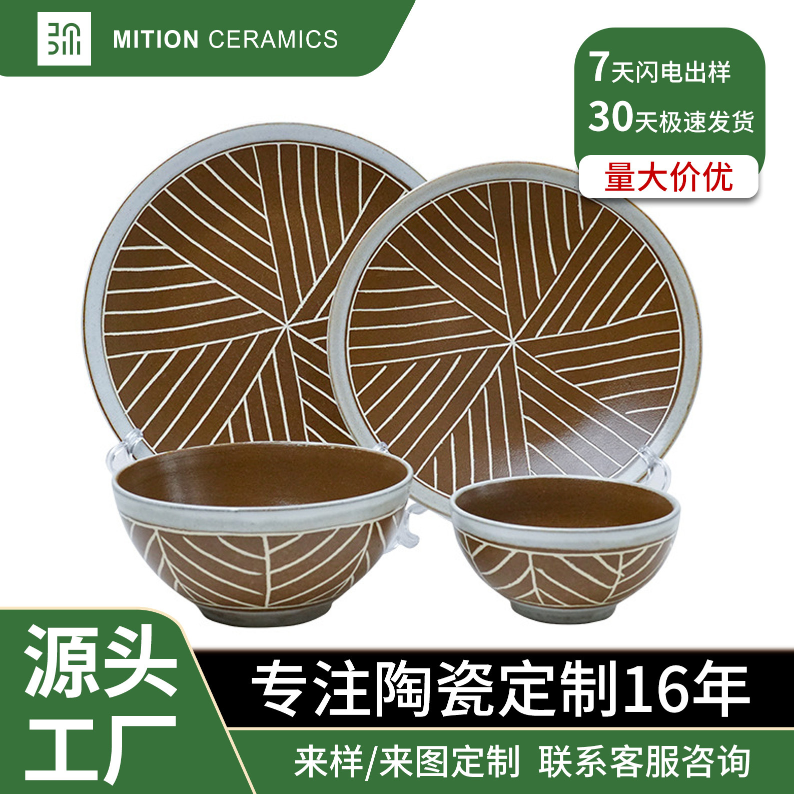 日本のレトロな縦模様の食器セット釉下色禅手作り粗い陶器のボウルとプレート 2025 新しいセラミックカスタマイズ