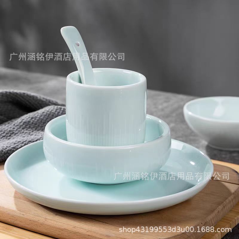 新型ホテルは食器を並べて天青釉陶磁器のカウンターの骨皿の四つのセットのレストランのあっさりしています。