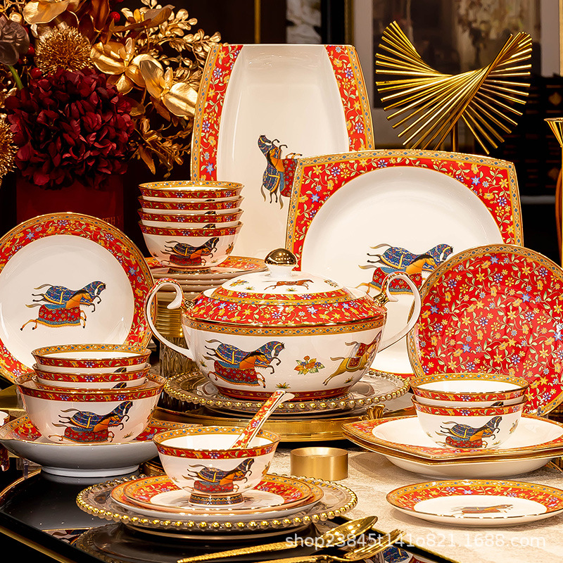 軽くて豪華な碗の皿のセットの家庭用高温の骨の磁器の食器の食器の皿のネットの赤い陶磁器の皿の贈り物の碗の箸の組み合わせ