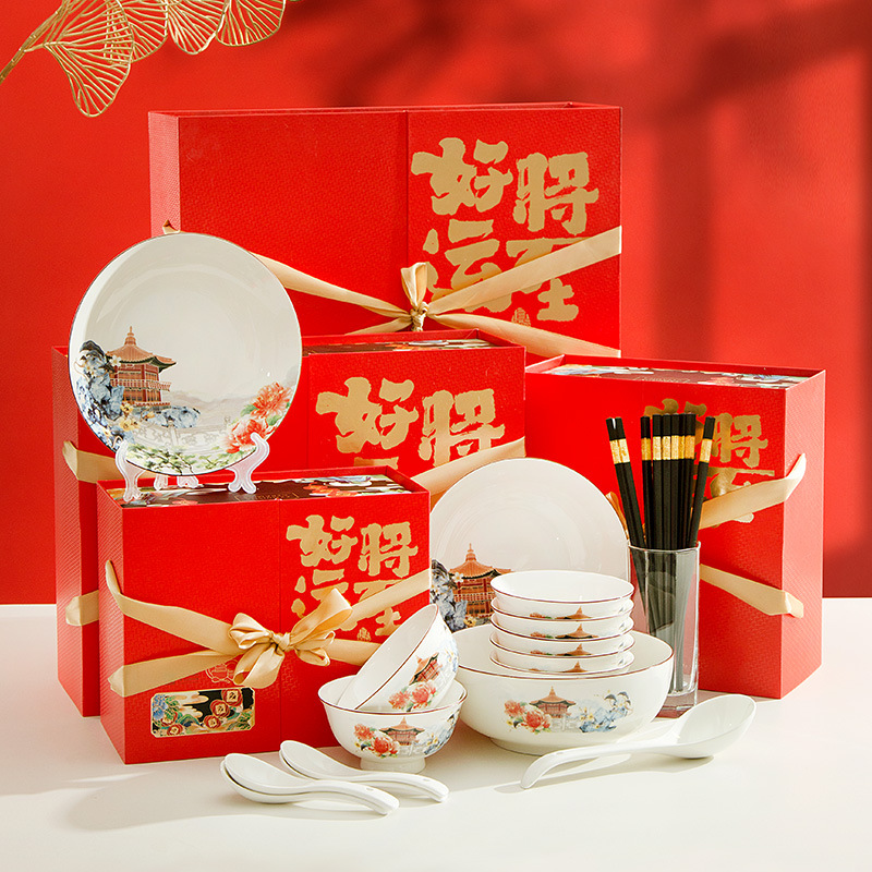 中国風のセラミック食器セットボウルスプーンプレートセットギフトボックス会社のオープニングイベント記念品卸売