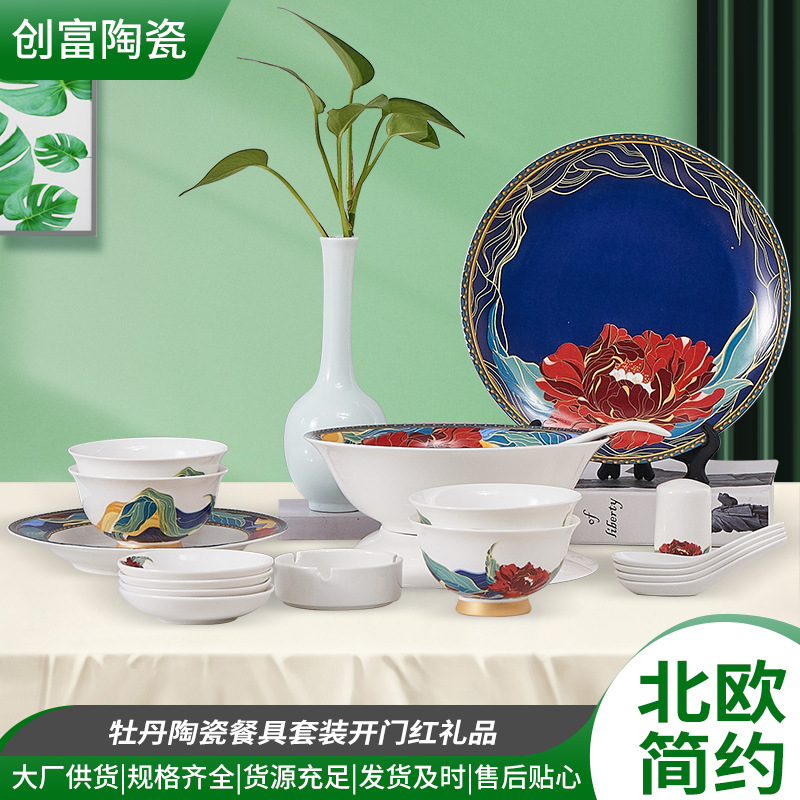 国潮牡丹陶磁器食器16頭骨磁器プレゼントセットプレゼント新中国式スプーン食器皿熱転写食器