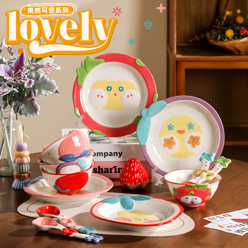 漫画風セラミックプレート 可愛いフルーツプレート サラダプレート 家庭用セラミックボウル レストラン用丸皿 スプーン 高級食器セット