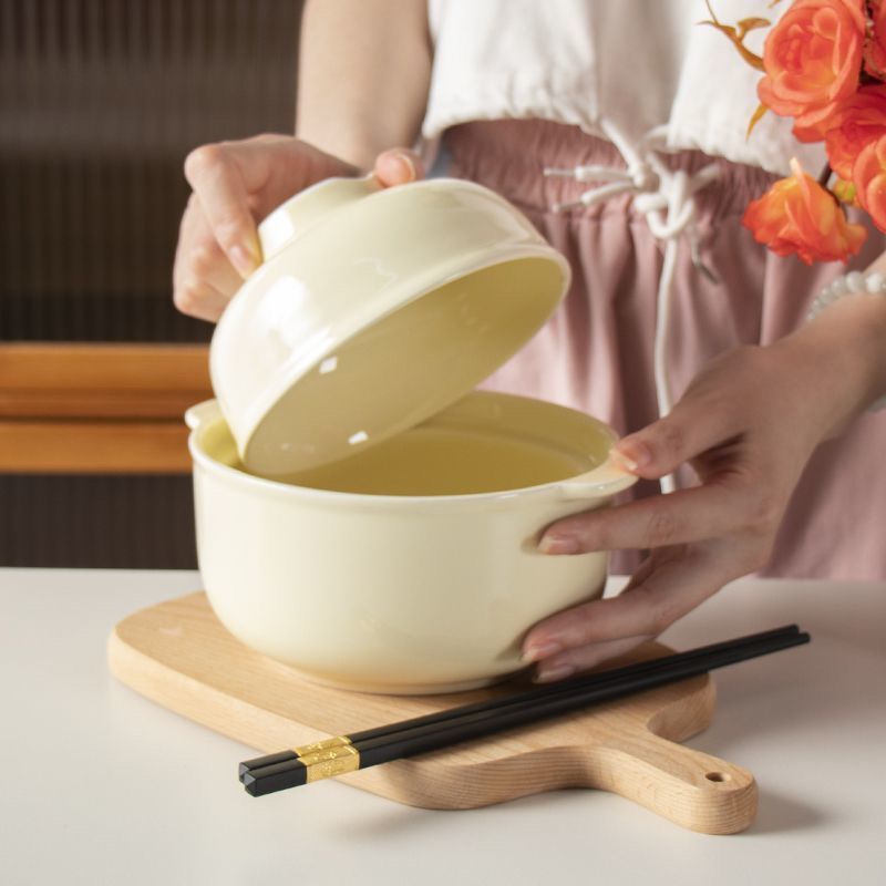 双耳学生ヌードルボウル食器釉下色高価値ミルクhuhuクリーム風シリーズインスタントラーメンボウルセラミック蓋付き