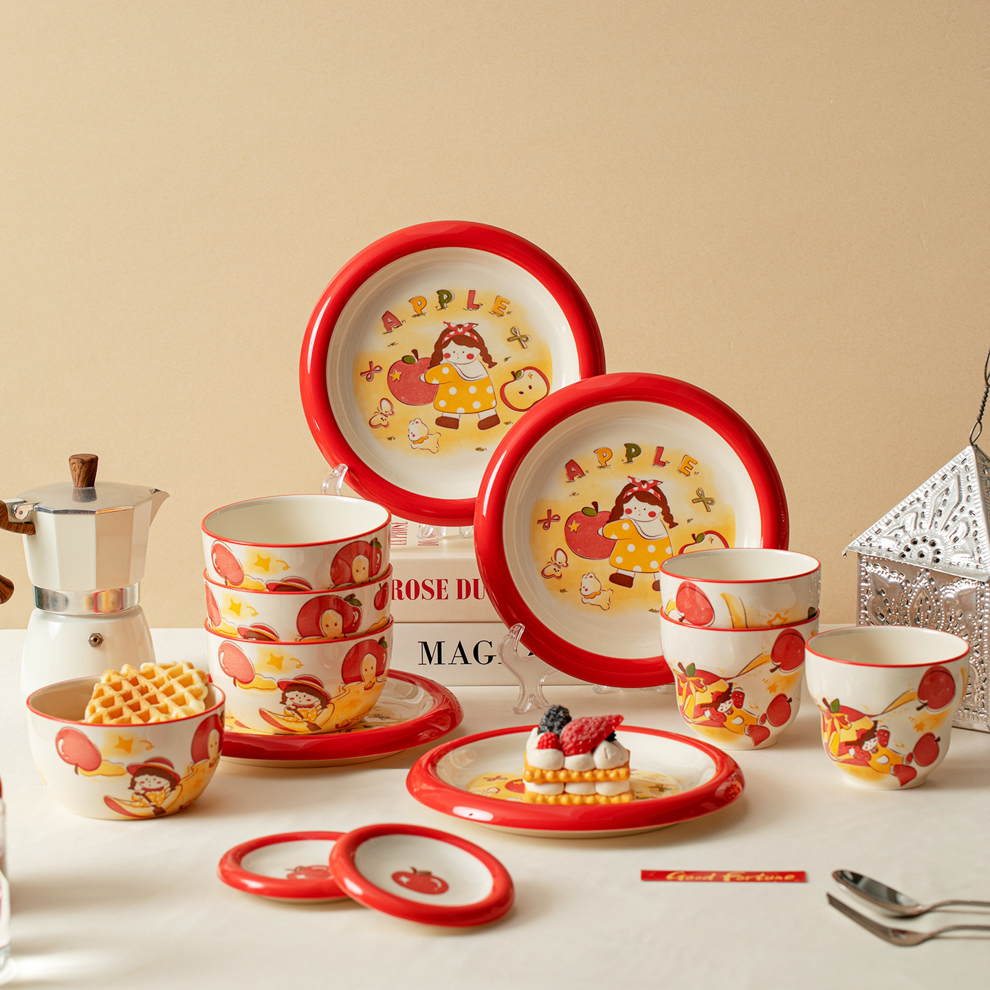 乳白色釉アップルガール漫画高価値食器セット 4 人家族家庭用かわいい子供用セラミック食器