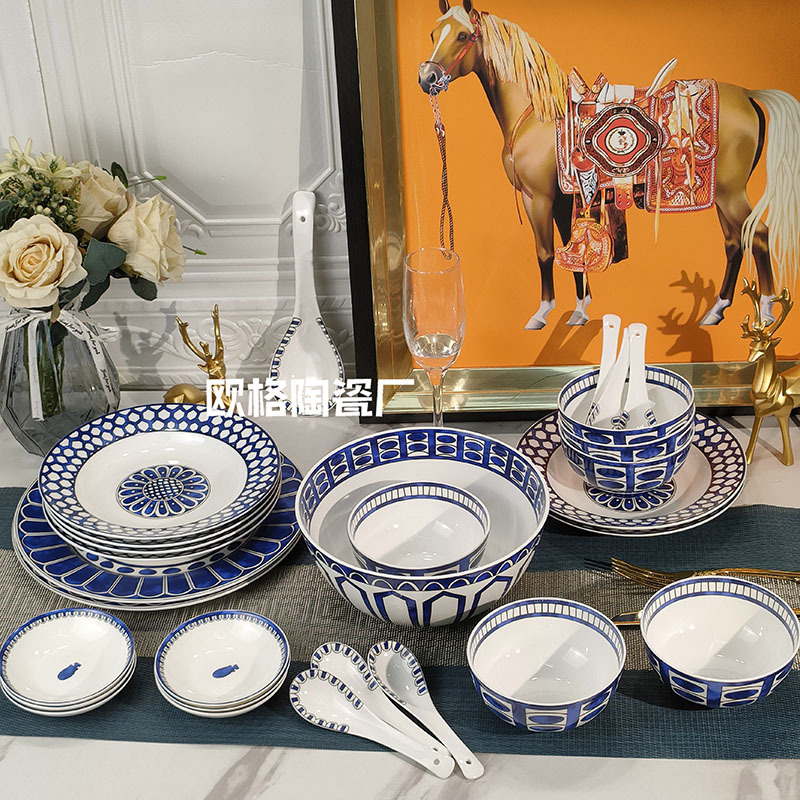 ヨーロピアンライトラグジュアリーブループリント28ピースカトラリーボウルスプーンスーププレートカトラリーセット結婚式新築祝い高級記念品