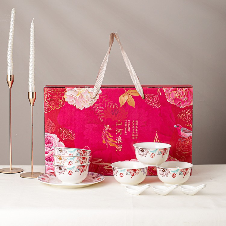 中国風の食器セット家庭用新婚食器と箸ライスボウルセラミックプレート結婚式の食器と食器セットギフトボックス