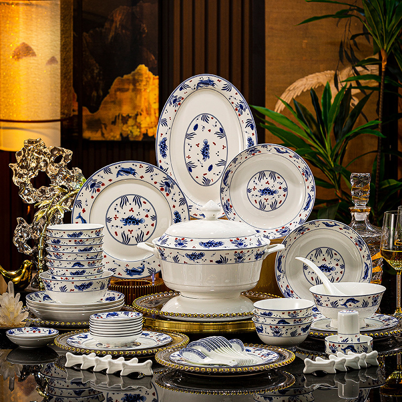 中国のアンティーク青と白の磁器食器景徳鎮釉薬ボーンチャイナ家庭用セラミック食器家族の宴会食器の完全なセット