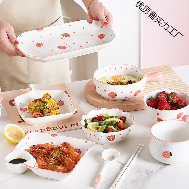 セラミックハンドルボウル家庭用食器水玉イチゴボウルとプレートのセット