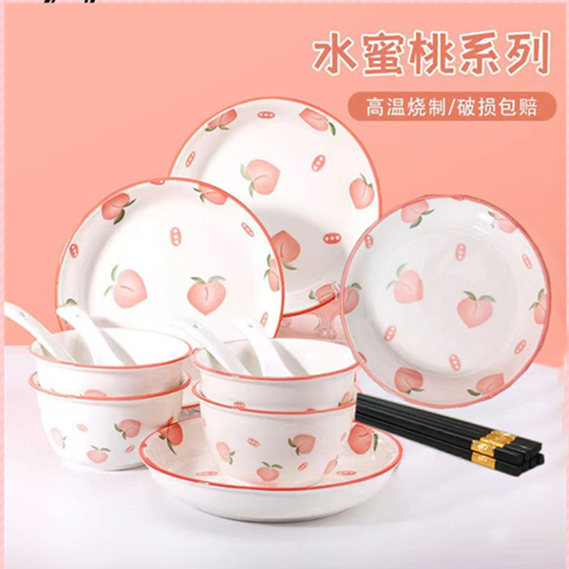 [Xu Jiannini] 高価値ピーチセラミック食器セット 16点セット かわいい下絵色クリエイティブ
