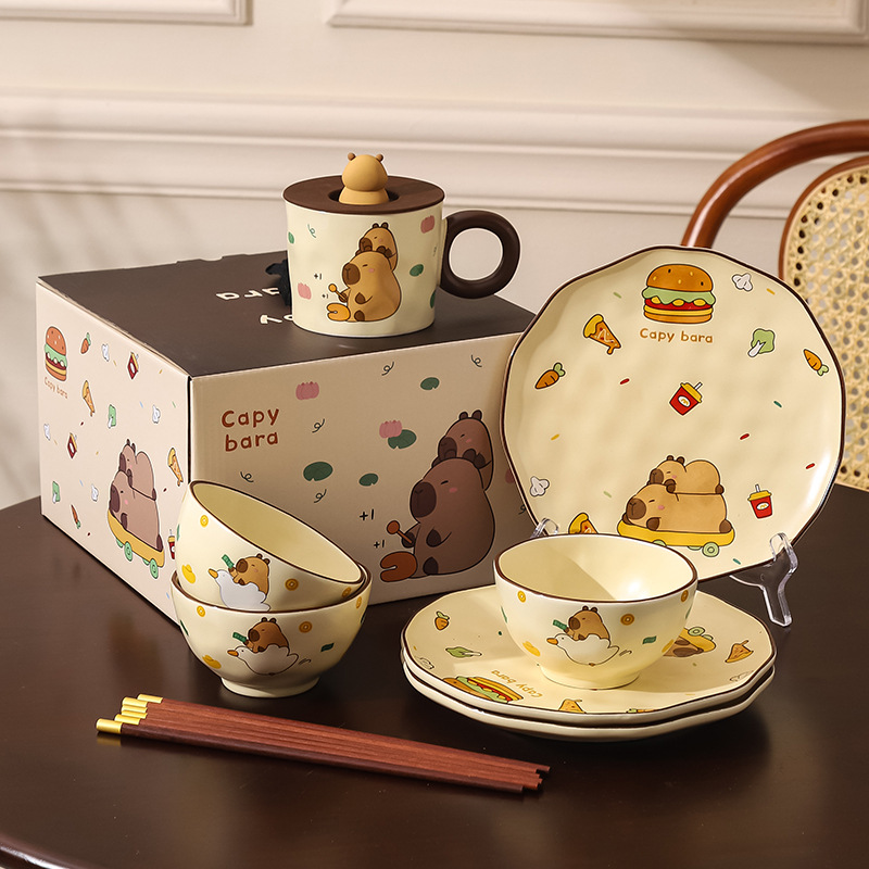 カピバラ カピバラ セラミック食器セット 1人用 ボウル、箸、プレート、カップ ホームギフトボックス 誕生日 クリエイティブなお土産