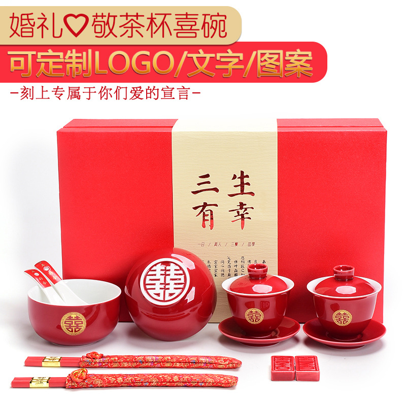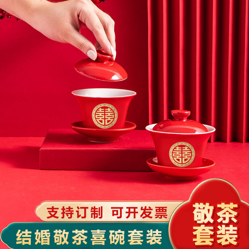 结婚敬茶杯喜杯喜碗套装婚礼改口敬茶碗红色盖碗婚庆用品伴手礼