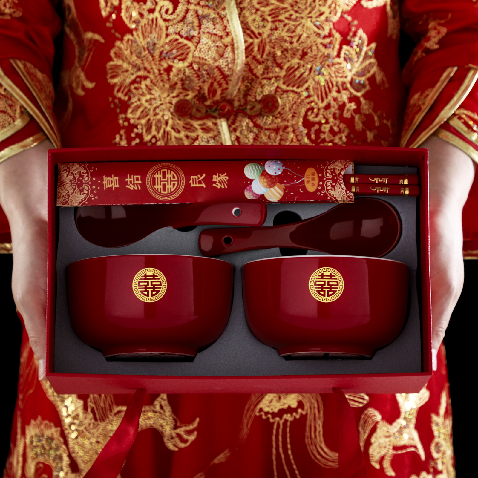 碗のギフトボックスの陶磁器の赤い碗の箸のセットの結婚のお返し用品の嫁入り用品の対碗の陶磁器の喜碗のお返しの結び