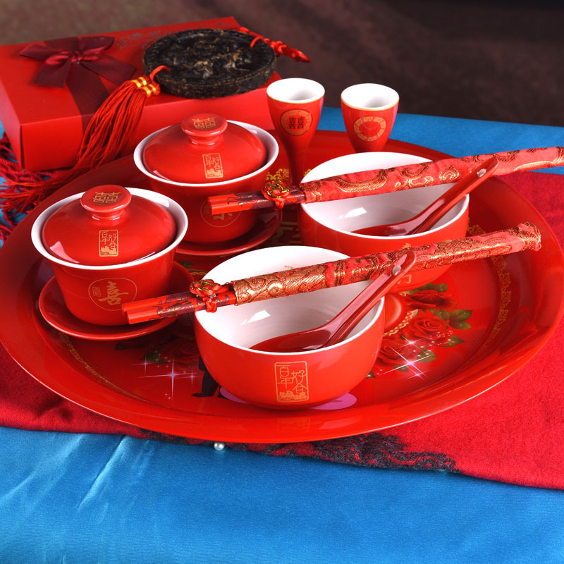 結婚祝いのお茶のコップの陶磁器は碗の箸のセットの結婚式の茶器のトレーの組み合わせの卸売りに対してロゴを加えることができます。