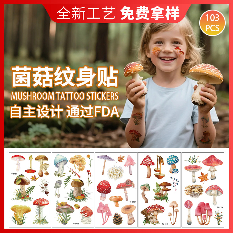 キノコタトゥーステッカー、楽しいさまざまな種類のバクテリアキノコの葉、子供用パーティー防水性と耐汗性の一時的なタトゥー
