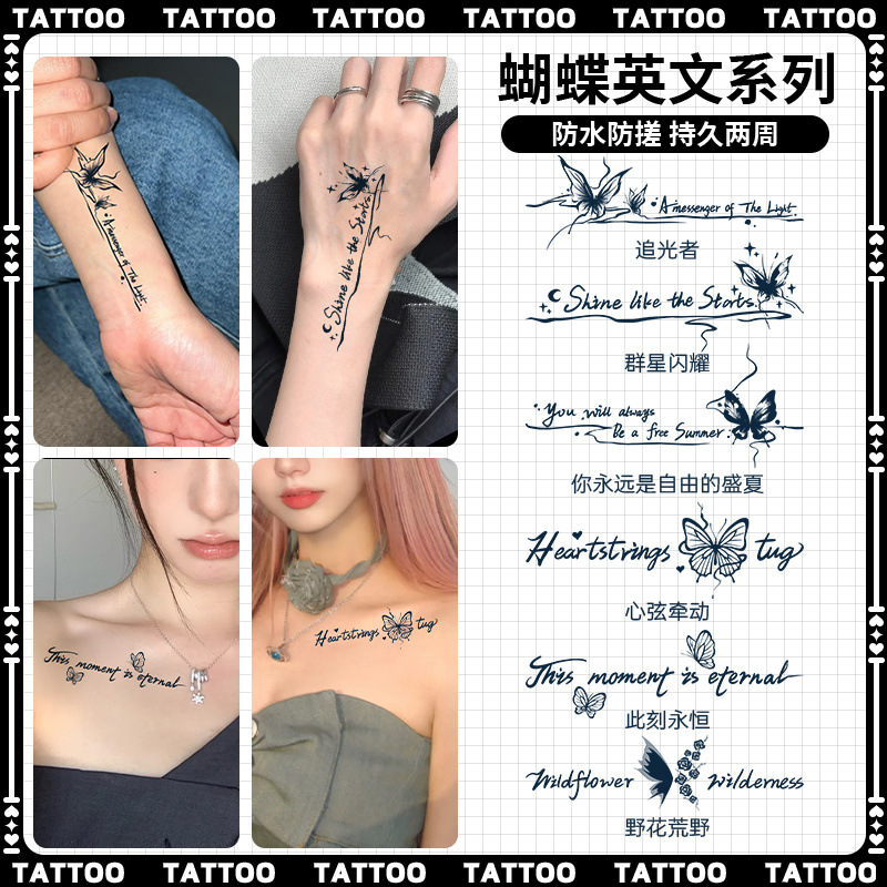 新しい文字蝶タトゥーステッカー半永久的な英語甘いクールなホットガールセクシーな鎖骨アームシミュレーションタトゥー