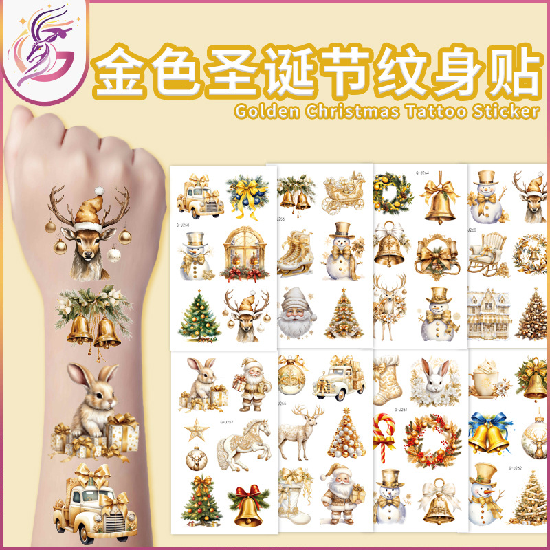 金色のクリスマスのタトゥーは様々な金色の鈴を貼っています。ヘラジカのサンタクロースはクリスマスパーティーの装飾に適しています