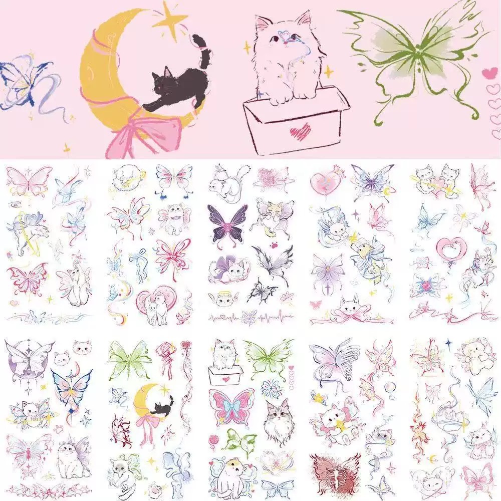 漫画アニメーション蝶と猫タトゥーステッカーガールハート長持ちインスタイル高価値塗装ステッカー diy 防水