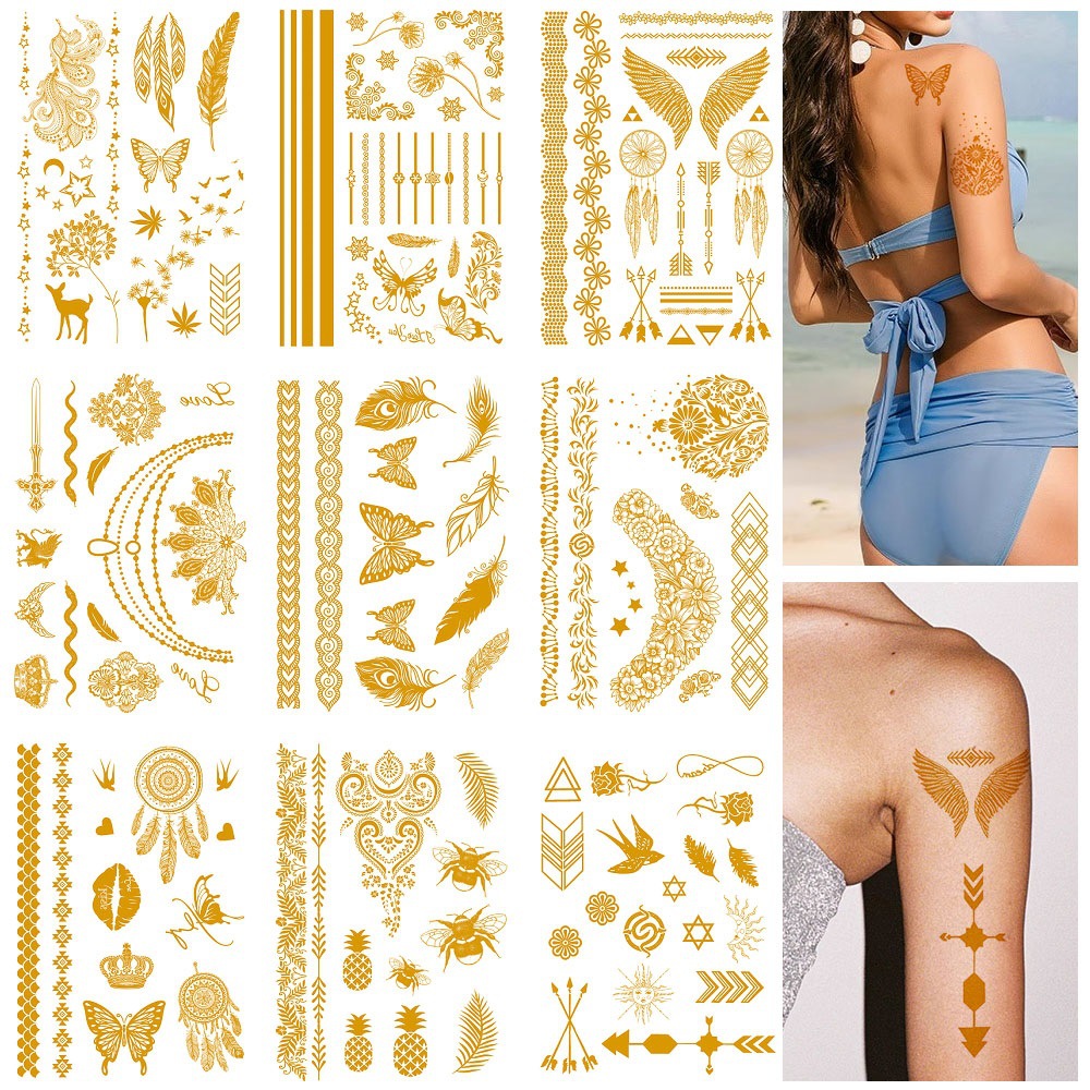 新型シングルゴールドタトゥーステッカーセット水転写印刷シミュレーション欧米の国境を越えた現物の金色のビーチパーティーシール