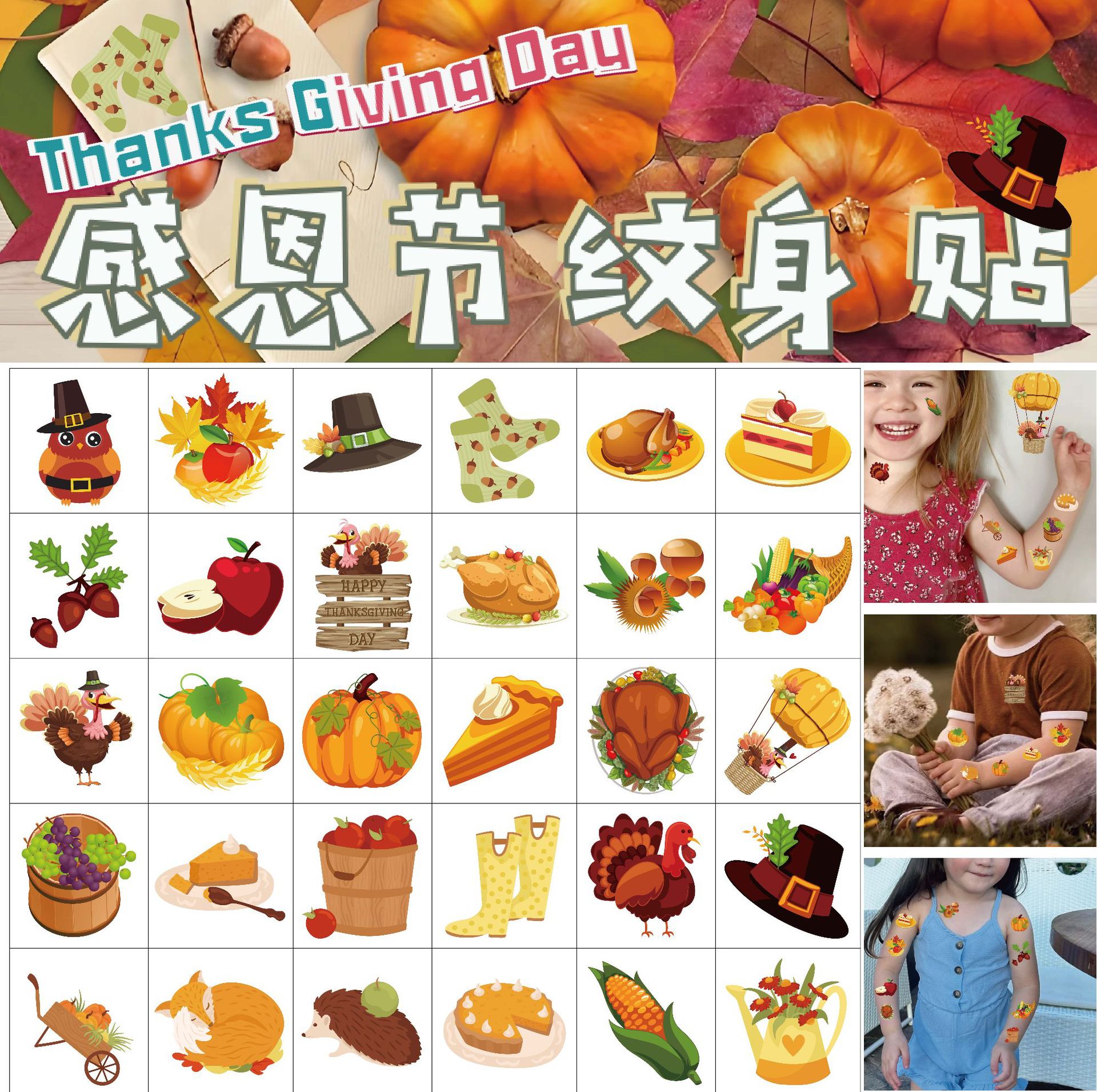 国境を越えた感謝祭のタトゥーは子供の祝日のかわいいシール漫画カボチャ七面鳥ケーキのタトゥーシールを貼っている