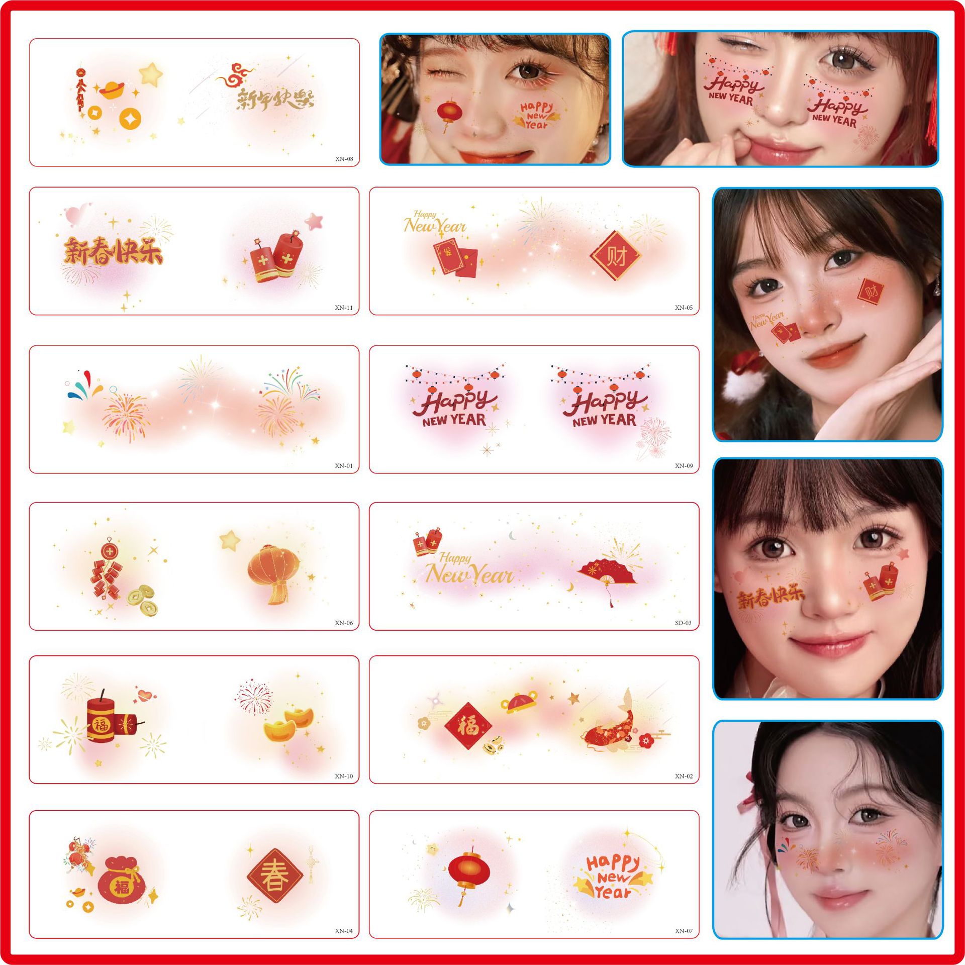 元旦の女の子のかわいい顔の化粧の新年の年を越えて創意的な顔は愛の頬紅のかわいい化粧を貼ってタトゥーのシールを貼ります。