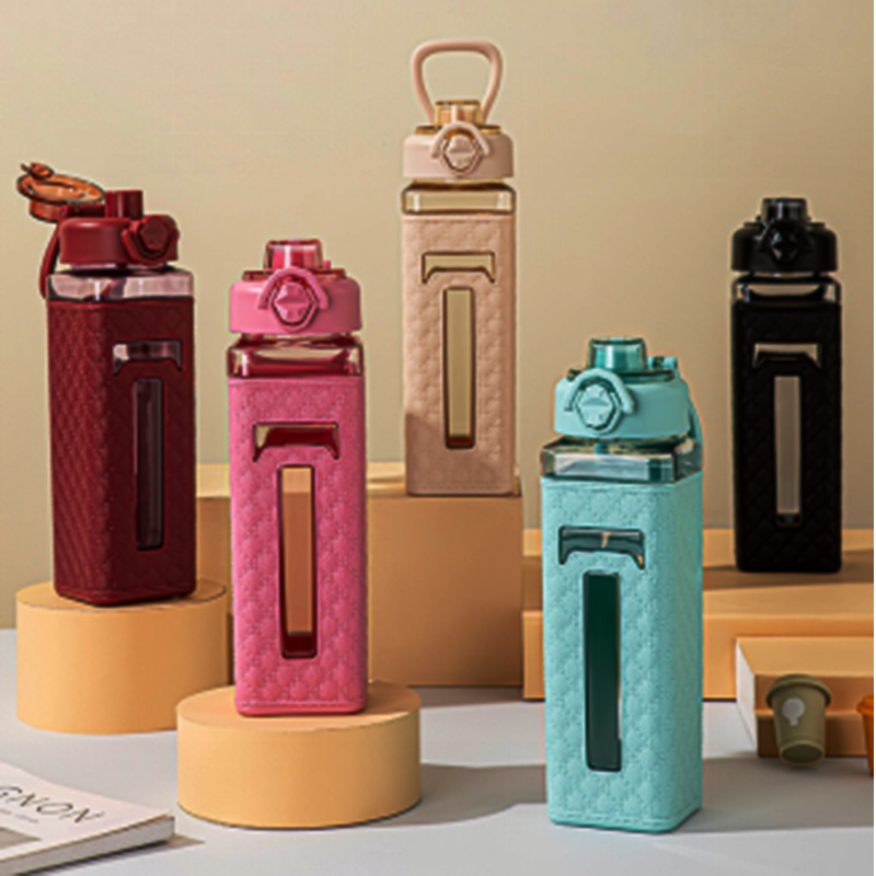 高見えロック付きプラスチック角カップ 弾性蓋付き スクエアスペースカップ ポータブル直飲みスポーツウォーターカップ RS-202068